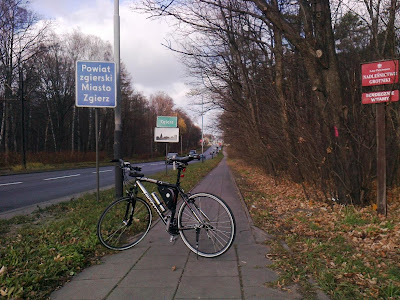 Podkręcam tempo jazdy, bo tuż za tabliczkami informującymi o tym, że wkraczam na teren powiatu i miasta Zgierz, mamy spory spadek terenu. Pędzę chodnikiem wzdłuż Lasu Chełmy.