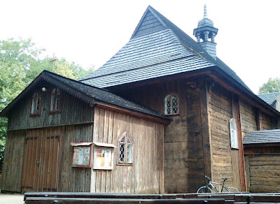| Kościół w Modlnej wzniesiono z modrzewiowych bali, które "dzielnie znoszą" działanie upływającego czasu i środowiska. Świątynię o podobnej budowie widziałem już w Budzynku podczas wiosennej WYCIECZKI Nr 72. |