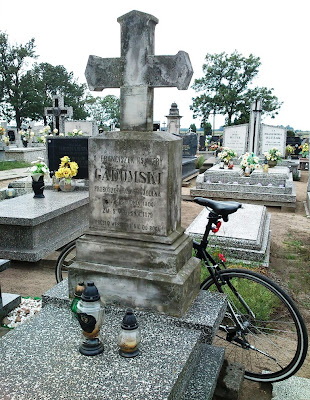 | Idę centralną alejką za kaplicę. Po prawej stronie ustawiony jest wspaniały pomnik z jasnego piaskowca i odłamanym krzyżem. |