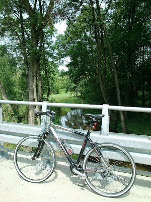 | Tam skręcam w lewo do mostu na rzece Moszczenica i wsi Anielin Swędowski. Dalej ciągle prosto wąską asfaltówką, która za przejazdem kolejowym przebiega pomiędzy działkami letniskowymi. |