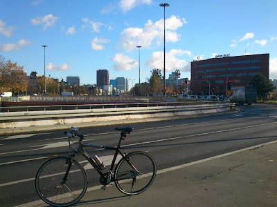 Patrząc z wiaduktu na wschód, widać doskonale łódzką trasę W-Z i szereg wspaniałych budowli, które oglądałem na początku WYCIECZKI Nr 68. Wykorzystując drogi rowerowe, jadę po al. Mickiewicza i al. Bandurskiego na osiedle mieszkaniowe Retkinia. |