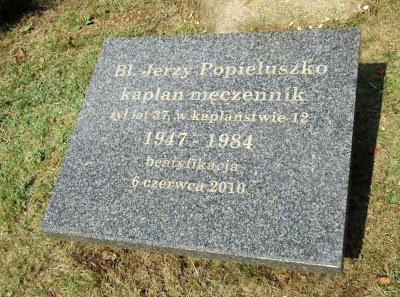 | Pod pomnikiem ułożona jest płyta z szarego granitu z napisem o treści : "Bł. Jerzy Popiełuszko kapłan męczennik żył lat 37, w kapłaństwie 12. 1947-1984, beatyfikacja 6 czerwca 2010". |