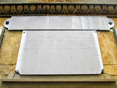 | Do cokołu przytwierdzona jest żeliwna tabliczka z informacją "Na pamiątkę Missyi odbytych w Parafii Stara Rawa w miesiącu maju 1906 roku". |