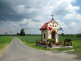 | Przed piękną kapliczką domkową, skręcam w lewo - na Cisów. |