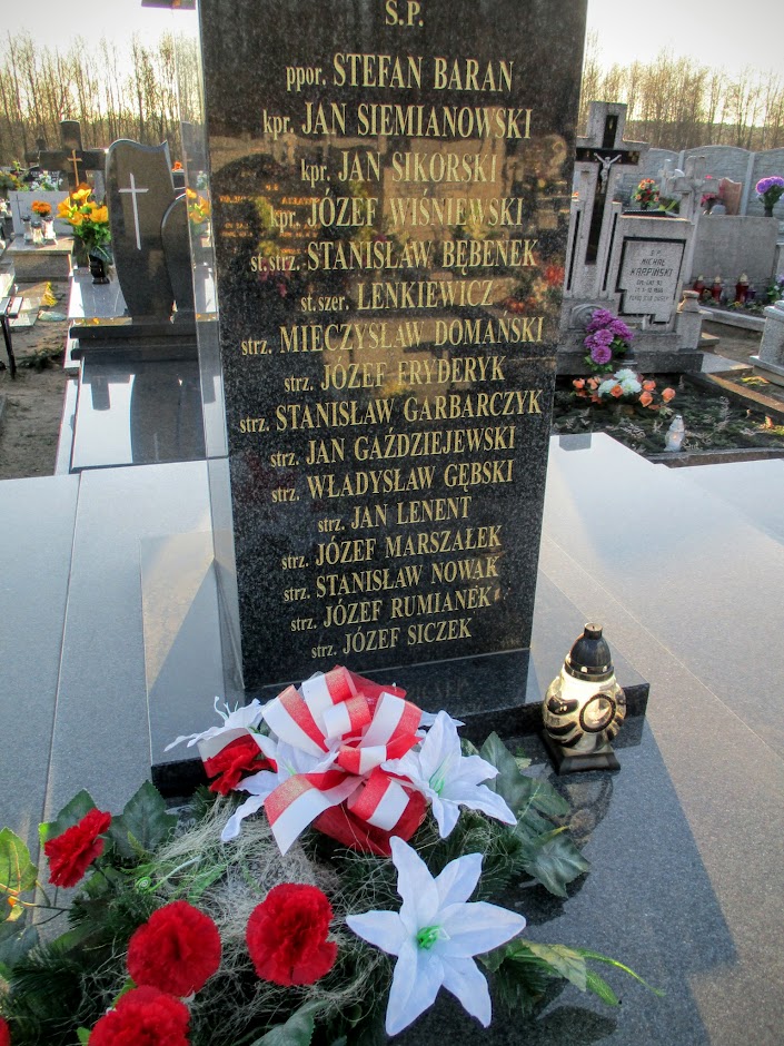 | "Ppor. Stefan Baran, kpr Jan Siemianowski, kpr. Jan Sikorski, kpr. Józef Wiśniewski, st. strz. Stanisław Bębenek, st. szer. Lenkiewicz, strz. Mieczysław Domański, strz. Józef Fryderyk, strz. Stanisław Garbarczyk, strz. Jan Gaździejewski, strz. Władysław Gębski, strz. Jan Lenent, strz. Józef Marszałek, strz. Stanisław Nowak, strz. Józef Rumianek, strz. Józef Siczek". |