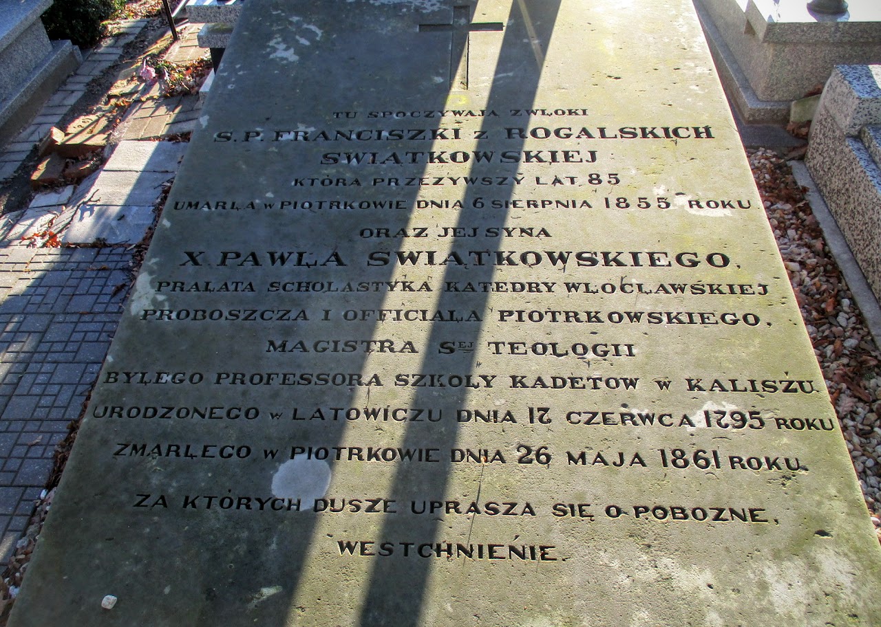 Cmentarz prawosławny połączony jest z nekropolią rzymsko-katolicką. Oglądam kilka zabytkowych pomników, ale przerywam zwiedzanie, bo musiałbym tu spędzić jeszcze co najmniej kilka godzin ! Płyta na grobie rodziny Światłowskich, gdzie pochowany został m.in. ksiądz Paweł Światłowski, prałat Katedry Włocławskiej, Proboszcz Piotrkowski, były profesor Szkoły Kadetów w Łowiczu (1795-1861).
