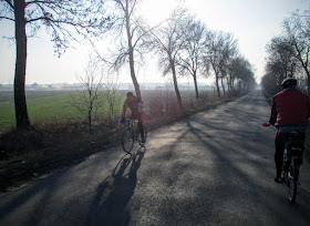 | Kiedy przejeżdżamy przez Lutosławice Rządowe, mijamy się z kolarzem ubranym jedynie w rowerową bluzę. Twardy zawodnik ! To jak na razie jedyny rowerzysta, jakiego spotkaliśmy po drodze z Łodzi. Poza tym na drogach jest tzw. zerowy ruch i wyprzedza nas tylko kilka samochodów. I nic dziwnego, bo większość "normalnych" ludzi odpoczywa po Sylwestrze i niewielu jest śmiałków, którzy w taki mróz wytknęliby nos z ciepłego domu. Mówię nawet do Konrada, że trzeba mieć naprawdę nierówno pod sufitem, aby w taki ziąb wybrać się na taką daleką, rowerową wycieczkę... Ale przecież "głupich nie sieją - sami się rodzą". |
