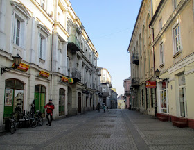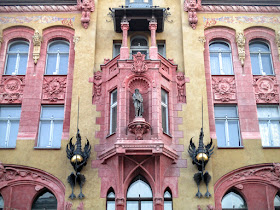 | Konrad to ranny ptaszek i już czeka na mnie na ul. Piotrkowskiej ! Umówiliśmy się na godz. 9:00 przed kamienicą pod Gutenbergiem. Na elewacji budynku dostrzec można okrągłe portrety mężczyzn w historycznych strojach. Te tajemnicze osoby to zapomniani dzisiaj graficy, drukarze i litografowie - Albrecht Durrer, Jan Fust, Piotr Schoffer (drukarze), Alojzy Senefelder (wynalazca litografii), Jan Breitkopf (wynalazca techniki druku nutowego), Karol Stanhope (konstruktor maszyn drukarskich), Ludwik Daguerre (pierwsze fotografie). |