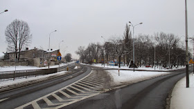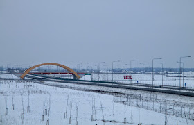 | Spoglądam z ciekawością na lewą stronę drogi, gdzie widać dobrze pasy ruchu, rząd latarni oraz nowoczesny wiadukt. Jest to węzeł autostradowy Kotliska. |