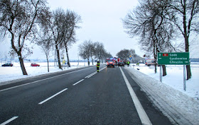 | Temperatura powietrza spadła do -5°C, zaczął sypać drobny śnieg i Mr SCOTT pędzi jak błyskawica ! Po chwili słyszę dźwięk syreny alarmowej. Czyżbym przekroczył dopuszczalną prędkość ? Uff ! To tylko wóz bojowy straży pożarnej. |