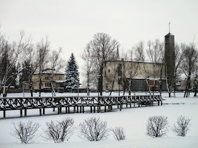 | Przejeżdżam przez most na rzece Mroga. Spoglądam na skuty lodem zalew Mrożyczka. |