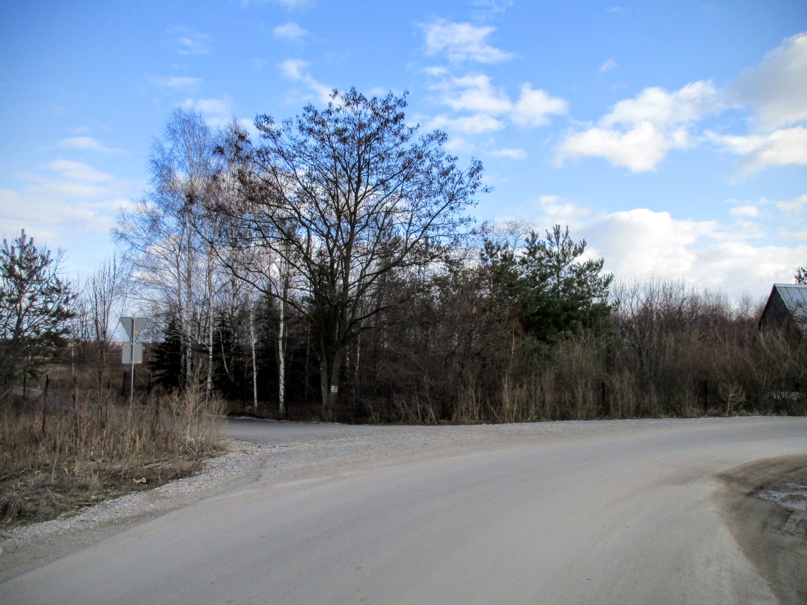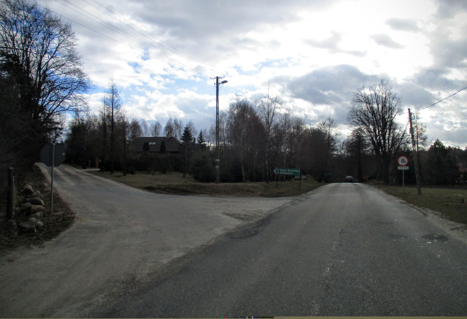 Jadę cały czas prosto po nierównej drodze do skrzyżowania, gdzie skręcić trzeba na lewo. Mijam kilka nowych domostw i wjeżdżam do niewielkiego lasu.