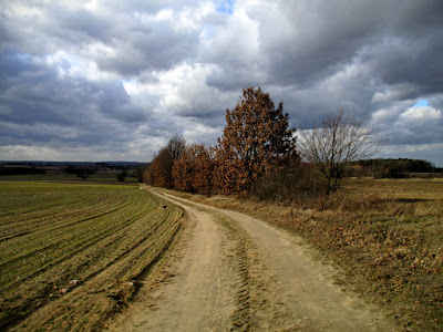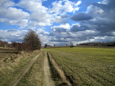 Dojeżdżam do krzyżówki z asfaltową szosą i jadę ciągle prosto polną drogą.