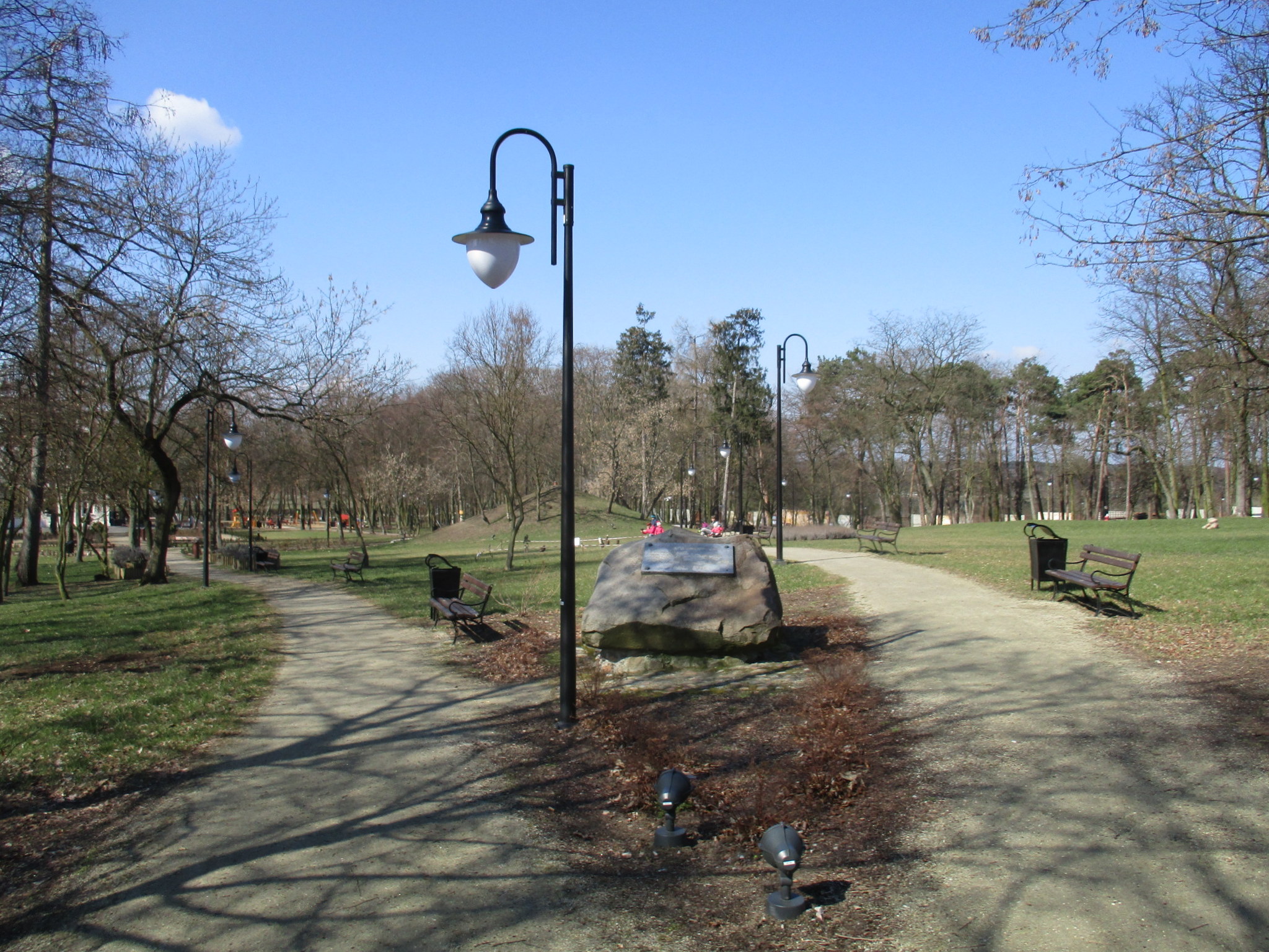 Obelisk z tablicą "M. Konopnicka. W kamieniu polnym... Niech mi kamieniarz lireczkę wyryje, a niechaj na nim napisu nie kładzie, i niech go w rzędzie nie stawia ni w składzie, tylko w zakątku gdzie brzoza szum niesie. 1862-1962".