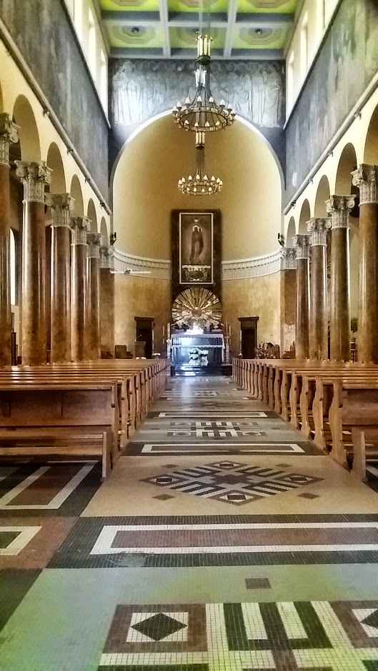 W kościele ułożono piękną posadzkę : w nawach kształty geometryczne, w prezbiterium - w nawiązaniu do wczesnochrześcijańskiej ikonografii - jelenie u Źródeł Wód.