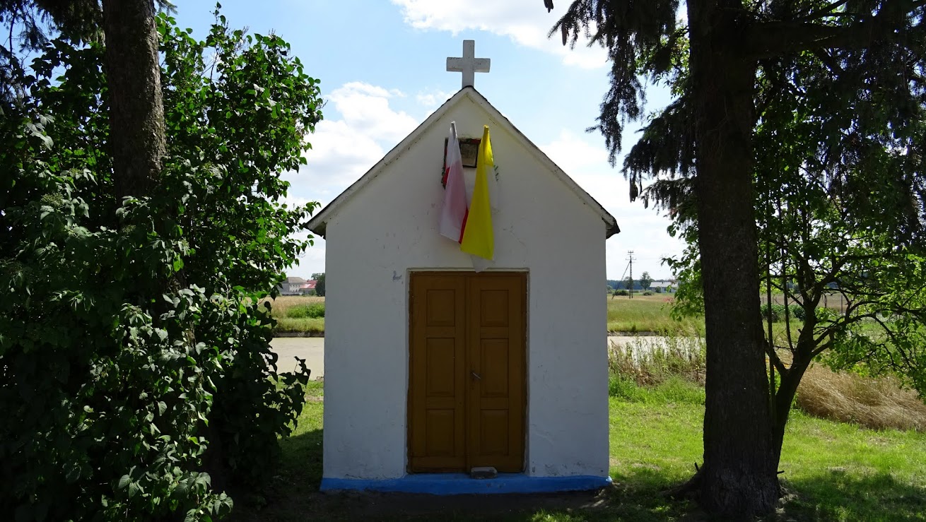 | Kapliczka z napisem "Boże błogosław tej ziemi, błogosław nasze domostwo całe, urodzaj cały, plony nie małe 1938 r.". |