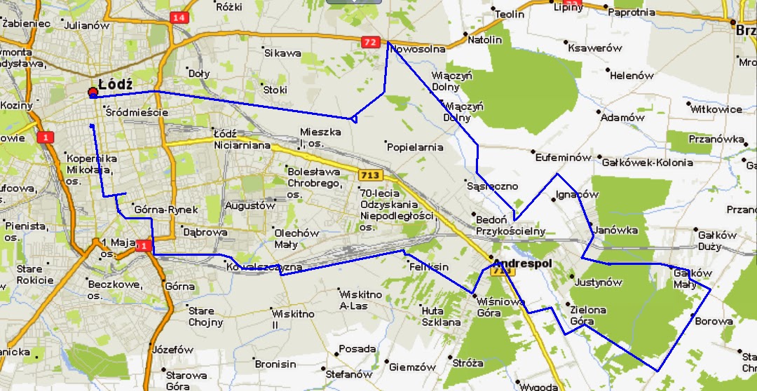 TRASA : Łódź (Wólczańska, Czerwona, Milionowa, Piotrkowska, Plac Reymonta, Rzgowska, Dąbrowskiego, Kilińskiego, Śląska, Wełniana, Kotoniarska, Tomaszowska, Jędrzejowska, Dworcowa, Feliksińska) - Wiśniowa Góra - Andrespol - Kraszew - Bukowiec - Zielona Góra - Borowa - Gałków Mały - Justynów - Janówka - Jordanów - Bedoń - Bedoń Wieś - Wiączyń Dolny - Łódź (Nowosolna, Wiączyńska, Pomorska, Plac Wolności)