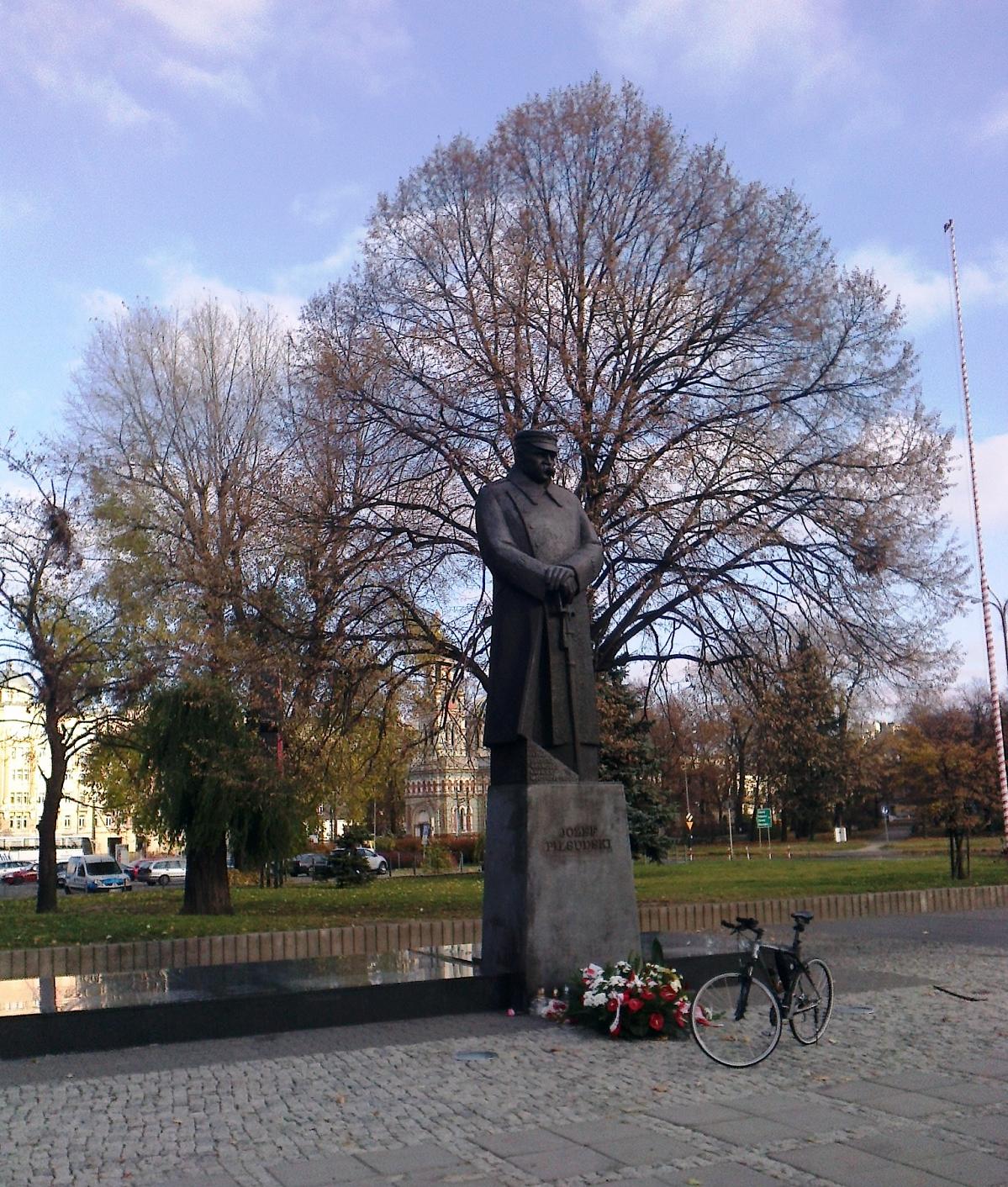 | Z ul. Gdańskiej kieruję się do skrzyżowania ul. Traugutta z Kilińskiego. Tuż obok hotelu "Centrum", stoi pomnik Marszałka Józefa Piłsudskiego, który odsłonięto w 1997 roku. |