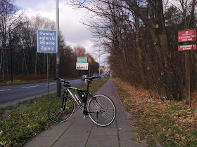 | Podkręcam tempo jazdy, bo tuż za tabliczkami informującymi o tym, że wkraczam na teren powiatu i miasta Zgierz, mamy spory spadek terenu. Pędzę chodnikiem wzdłuż Lasu Chełmy. |