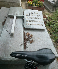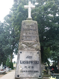 Idę na południe główną aleją, przy której po prawej stronie, wyróżnia się duży grobowiec Rodziny Laskowskich i Pruskich. Na płycie nagrobnej znajdują się cztery żelazne uchwyty, a pomiędzy nazwiskami wyryto datę "1877 R.".
