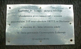 Na kapliczce umieszczono tabliczkę z informacją o treści "Kapliczka św. Izydora - patrona rolników, ufundowana przez nauczycieli i uczniów, pracowników ZSP oraz członków ORTUL w Głuchowie w rocznicę 45-lecia istnienia szkoły i 75-lecia powstania Uniwersytetu Ludowego. 13 czerwca 2010 r.".