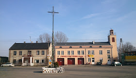 | Po prawej stronie szosy znajduje się remiza Ochotniczej Straży Pożarnej w Podolinie, która mieści się w piętrowym budynku dawnej szkoły podstawowej. |
