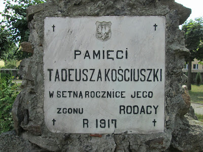 | Na pomniku umieszczona jest kwadratowa tablica z białego piaskowca, z wizerunkiem orła w koronie oraz napisem "Pamięci Tadeusz Kościuszki w setną rocznicę Jego zgonu. rodacy. R.1917". |