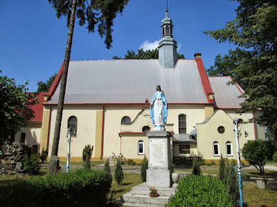| Na terenie placu przykościelnego jest także bardzo ładna figurka z postacią Najświętszej Maryi Panny. Rzeźba ustawiona jest na kamiennym postumencie i przedstawia Matkę Boską w niebieskiej sukience. |