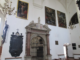 | Zaglądamy pod kościół p.w. Świętego Kazimierza Królewicza. Drzwi kruchty są otwarte i przez zamkniętą kratę, można dostrzec wyposażenie świątyni. |