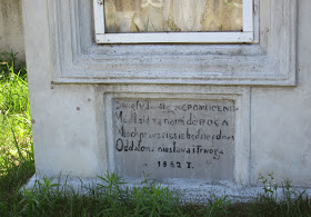 | W jej dolnej części, u podstawy cokołu widoczna jest tabliczka z napisem "Święty Nepomucenie módl się za nami do Boga. Niech przez Ciebie będzie od nas oddalona niesława i trwoga. 1852". |