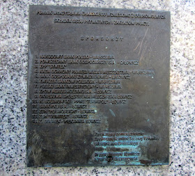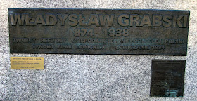 | Niżej wisi tablica z napisem "Pomnik Władysława Grabskiego wzniesiono z dobrowolnych składek osób prywatnych i zakładów pracy" i długa lista sponsorów. |