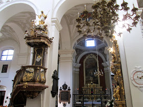 | Ambona w stylu rokoko z ok. 1750 roku oraz olejny obraz malowany na płótnie "Objawienie Maryi Matki Bożej zakonnikowi" z początków XVIII wieku, w ołtarzu stojącym po lewej stronie prezbiterium. |