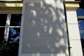 | Kilka metrów dalej znajduje się pomnik papieża Jana Pawła II, który został odsłonięty 18 czerwca 2000 roku. |