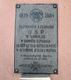 | Pierwsze zastępy strażackie założono w 1979 roku. Na ścianie remizy zawieszona jest pamiątkowa tablica. |