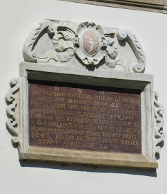 | Na elewacji zewnętrznej kościoła znajduje się kilka pamiątkowych tablic. Płyta z czerwonego marmuru z 1611 roku z łacińskimi inskrypcjami dot. powiększenia kościoła do 3-nawowego. |