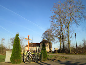 | Po zwiedzeniu stacji kolejowej, wracam do drogi prowadzącej do dworca. Stoi tam drewniany krzyż, obsadzony w murowany postument. |