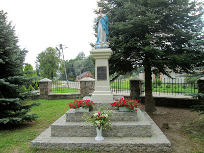 Na placu przykościelnym ustawiona jest figura Najświętszej Maryi Panny, która odziana jest w niebieską sukienkę. |