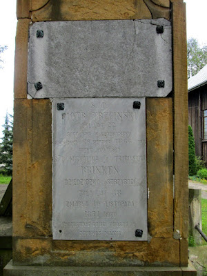 Szukam i znajduję kolejne, stare pomniki. "Tu spoczywają zwłoki Kazimierza Poltew, zmarł d. 8 grud. 1863 i żony jego Maryi z Grand Jear... zmarłej d. 17 maja 19.. Pokój ich zacnym duszom". |