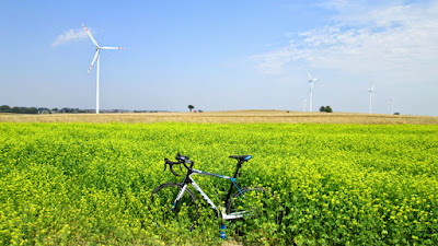 Widok jest rzeczywiście imponujący ! Dopełnieniem nieziemskiego krajobrazu, są ogromne połacie kwitnącego na żółto rzepaku. Pola ciągną się aż po horyzont, a pośród nich kręcą się potężne śmigła BAZ OBCYCH. Spędzam tu dobry kwadrans, upajając się niesamowitymi widokami. |