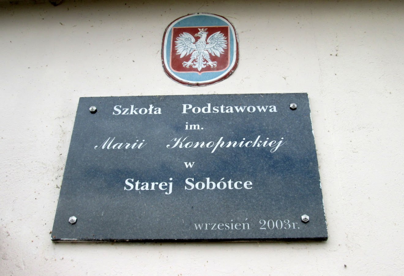 Na ścianie budynku zawieszona jest pamiątkowa tablica, którą odsłonięto 5 września 2003 roku. W tym dniu odbyła się bowiem uroczystość nadania szkole imienia naszej słynnej pisarki.