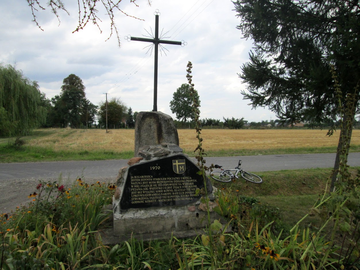 Bardzo lubię pedałować w tej części regionu łódzkiego ! Wyjeżdżając ze wsi Grodzisko, mijam nowy, ogromny krzyż, stojący po lewej stronie równej szosy. Po chwili podejmuję decyzję, że pojadę dalej przez miejscowości, w których jeszcze nigdy nie byłem.