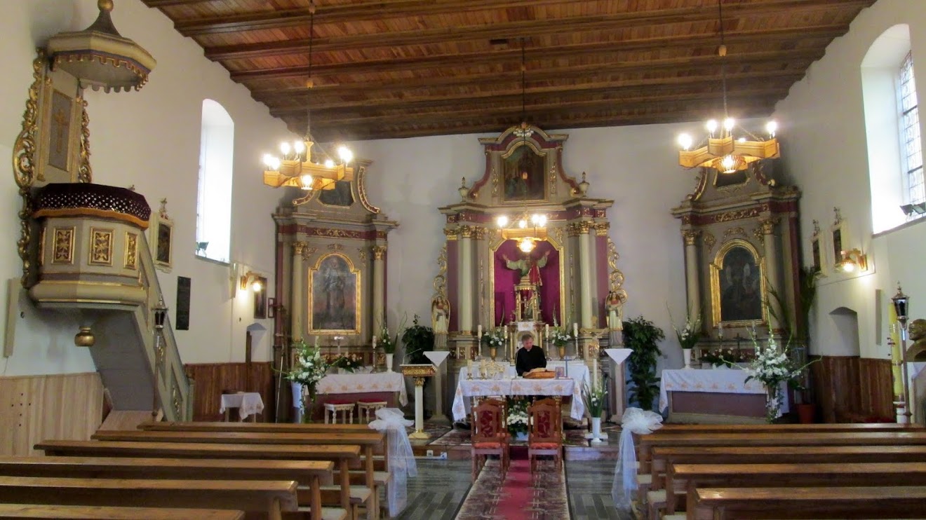 Przed ołtarzem ustawione są obecnie wieńce dożynkowe, które wykonano ze słomy i kłosów zbóż !