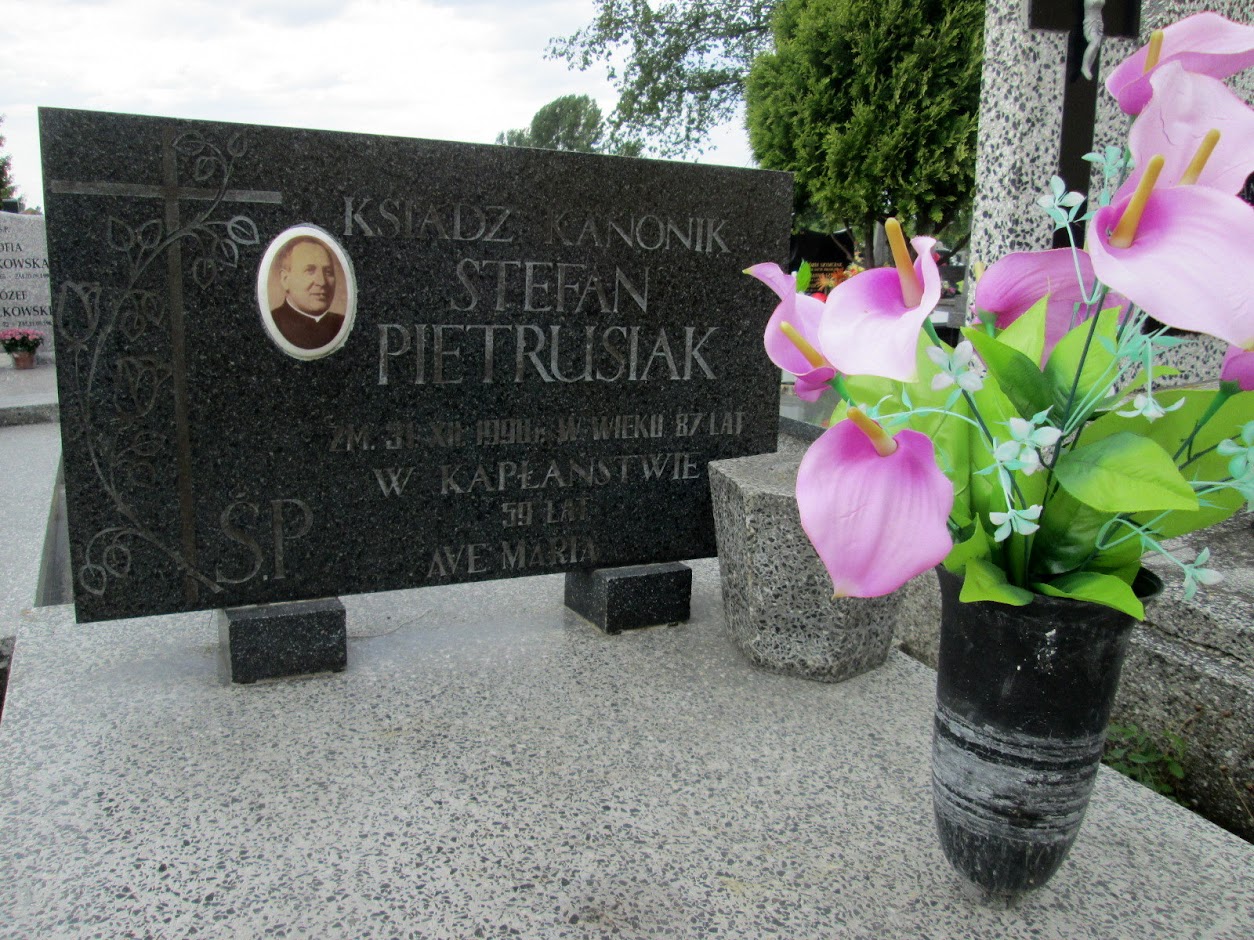 Na zakończenie zwiedzania cmentarza, trafiam jeszcze pod mogiłę księdza kanonika Stefana Pietrusiaka. "Zm. 30.XII.1990 r. w wieku 87 lat. W kapłaństwie 50 lat. Ave Maria".
