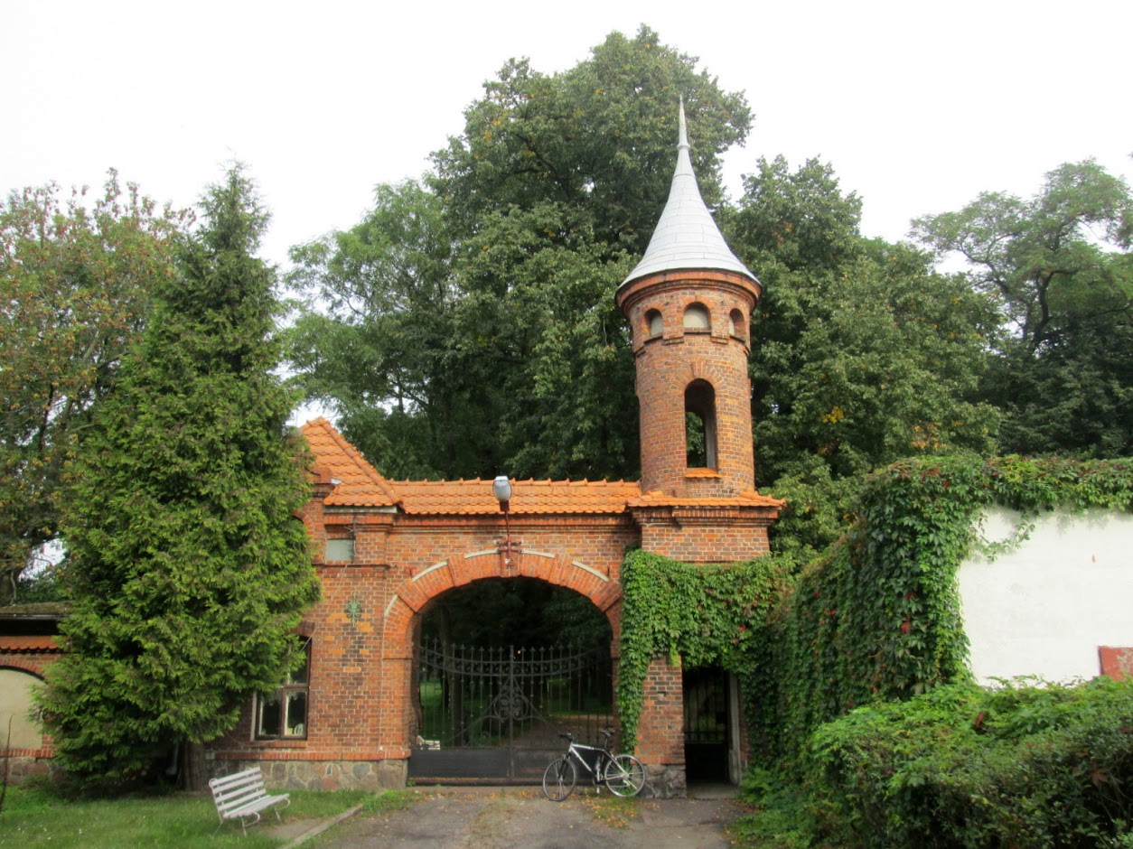 Wybrukowana aleja prowadzi do bramy pałacowej.Posiada ona prostokątny otwór i pomieszczenie dla stróża