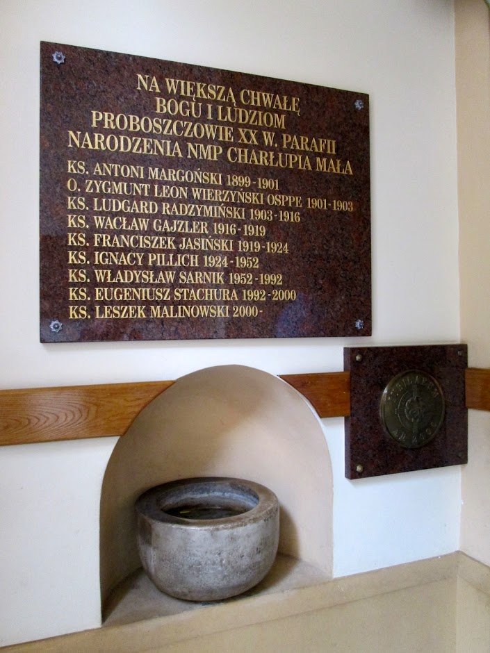 W kruchcie zawieszone są dwie tablice : "D.O.M. dnia 8. września 1937 r. z upoważnienia Kapituły Bazyliki Watykańskiej J.E. Karol Mieczysław Radoński Biskup Włocławski dokonał uroczystej koronacji cudownego obrazu Matki Boskiej Charłupskiej w obecności księży biskupów : Włodzimierza Jasińskiego, Biskupa Łódzkiego, Antoniego Laubitza Bisk. Sufr. Gnieźnieńskiego, Leona Wetmańskiego, Bisk. Sufr. Płockiego, Karola Niemiry, Bisk. Sufr. Pińskiego, prześwietnych Kapituł Włocławskiej i Kaliskiej, licznego duchowieństwa oraz wielkiej rzeszy wiernych za księdza proboszcza kanonika Ignacego Pillicha. Salve Regina".