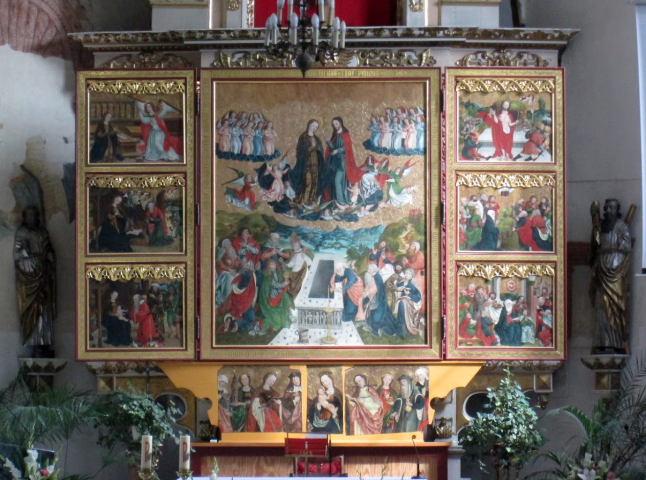 Wchodzę do kruchty i przez oszklone drzwi, podziwiam przepiękny ołtarz główny. Jest wypełniony późnogotyckim obrazem przedstawiającym Wniebowzięcie Matki Boskiej (z początku XVI wieku.
