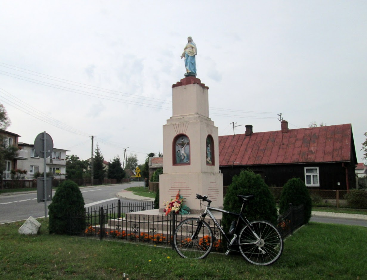 Krążę kilka minut po wsi, wypatrując co ciekawsze obiekty. Przy szosie ustawiona jest kapliczka z figurą Serca Jezusowego.