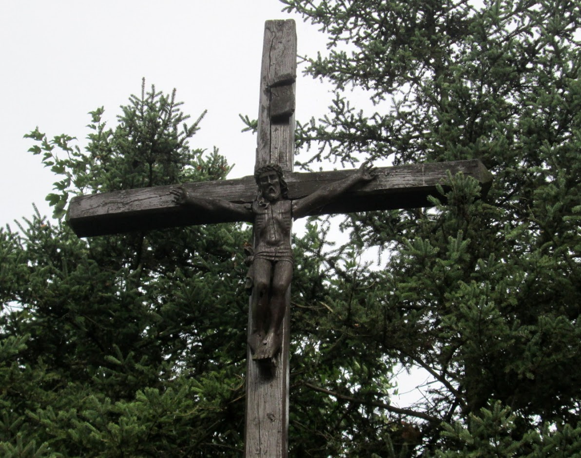 Na krzyżu zawieszona jest rzeźba konającego Chrystusa, która pochodzi z okresu międzywojennego.