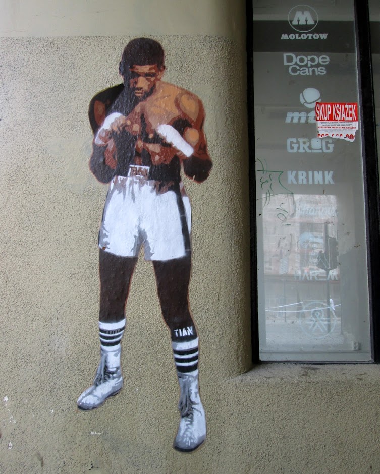 W podcieniach zabytkowej kamienicy Fiszera, pojawiły się dwie nowe prace street-art'owca, podpisującego się ps."Tiam". Pierwsza wlepka przedstawia czarnoskórego boksera.