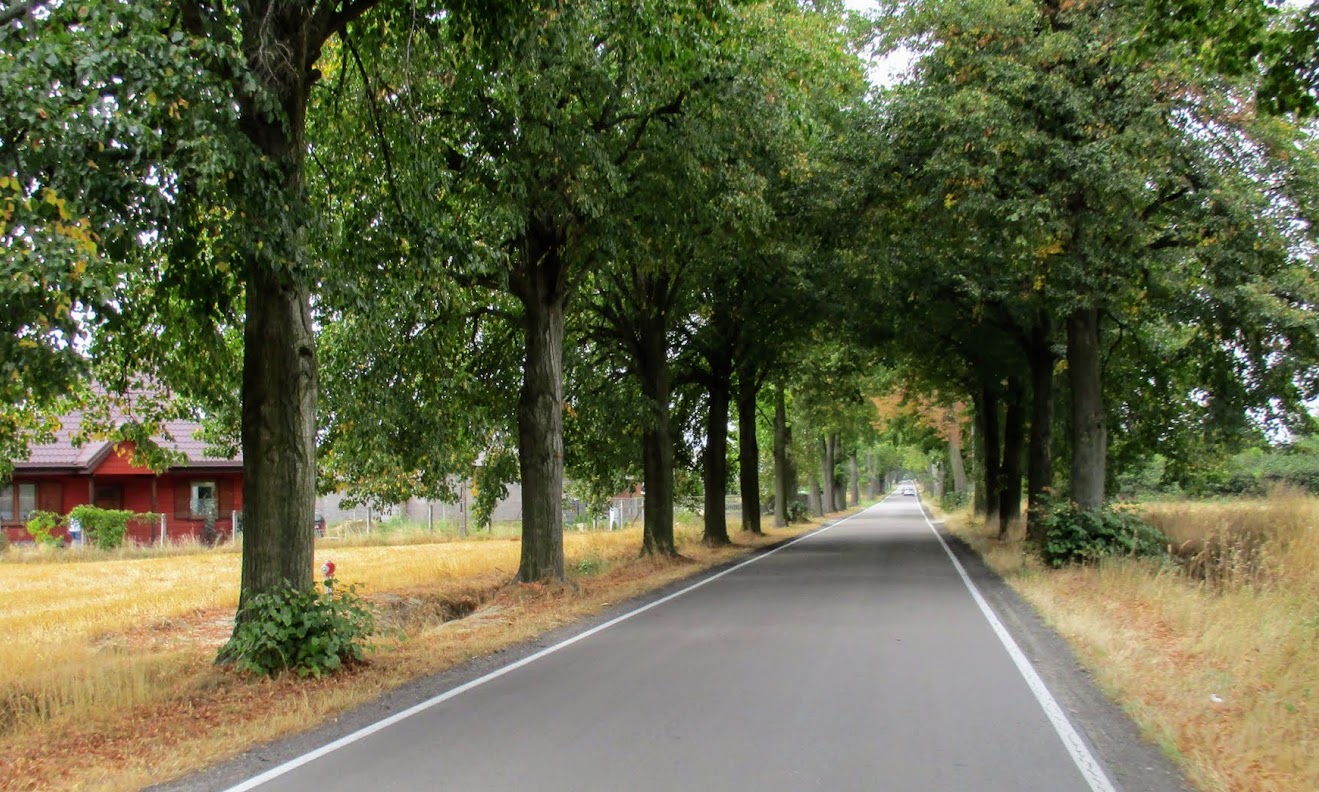 Wieś Kolonia Żywocin. Po tej równej drodze przebiega fragment rowerowego Szlagu Grunwaldzkiego.